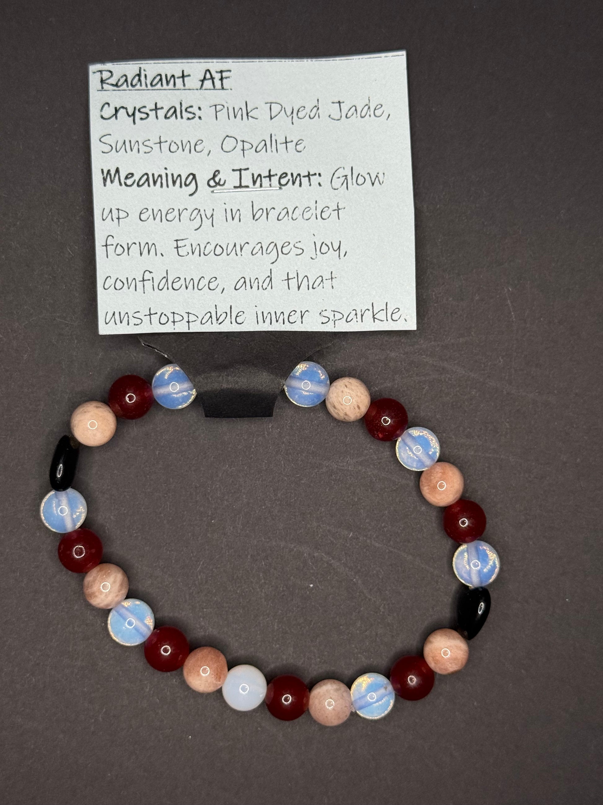 A power combo designed to fuel joy, confidence, and that unstoppable inner sparkle. Sunstone lights up your personal power, opalite boosts intuition and emotional clarity, and pink dyed jade brings warm, steady self-assurance. Together they amplify the energy of someone stepping fully into their glow.